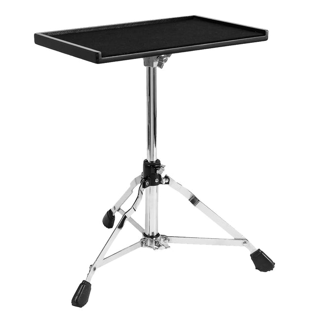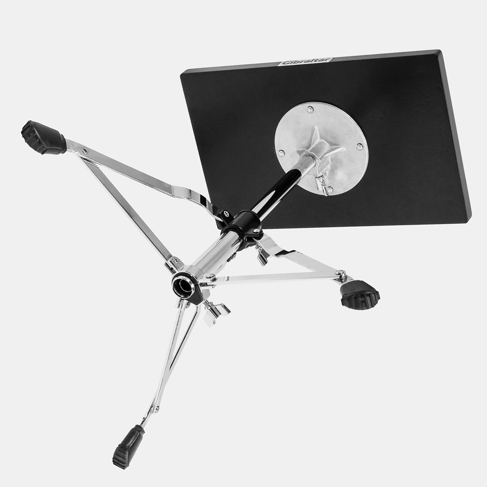 The G-SES Gibraltar Sidekick Essentials Station is a slim 16”x10” table mounted onto a low base tripod stand designed to support your mixer, electronics, or any essentials a drummer may have. The wood tabletop is lined with soft black felt to protect your things. There is a protective edge lining three sides to prevent slippage but the player’s side is open to allow for oversized mixers or percussion accessories. The lightweight low profile tripod adjusts from a super low 14 ½” to 22 ½” which allows you to place your Sidekick where you need it, discrete and convenient.