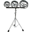 The Rototom® Set is constructed with a rapid-tuning system, allowing for instant tuning in a range of more than one octave. The Rototom® Set does not have a traditional drum shell. Instead, the drumhead and counterhoop are mounted on an aluminum frame (spoke) through which the tension rods are attached to a bottom frame which is mounted on a threaded center bolt. Rotating the frame raises or lowers the tension, thus raising or lowering the pitch of the drum. Their versatility has led to the widespread use of Rototoms in live situations, recording studios, percussion ensembles, and symphonic Concert music. Rototom sets feature three Rototoms mounted on a single stand for versatility and convenience.
